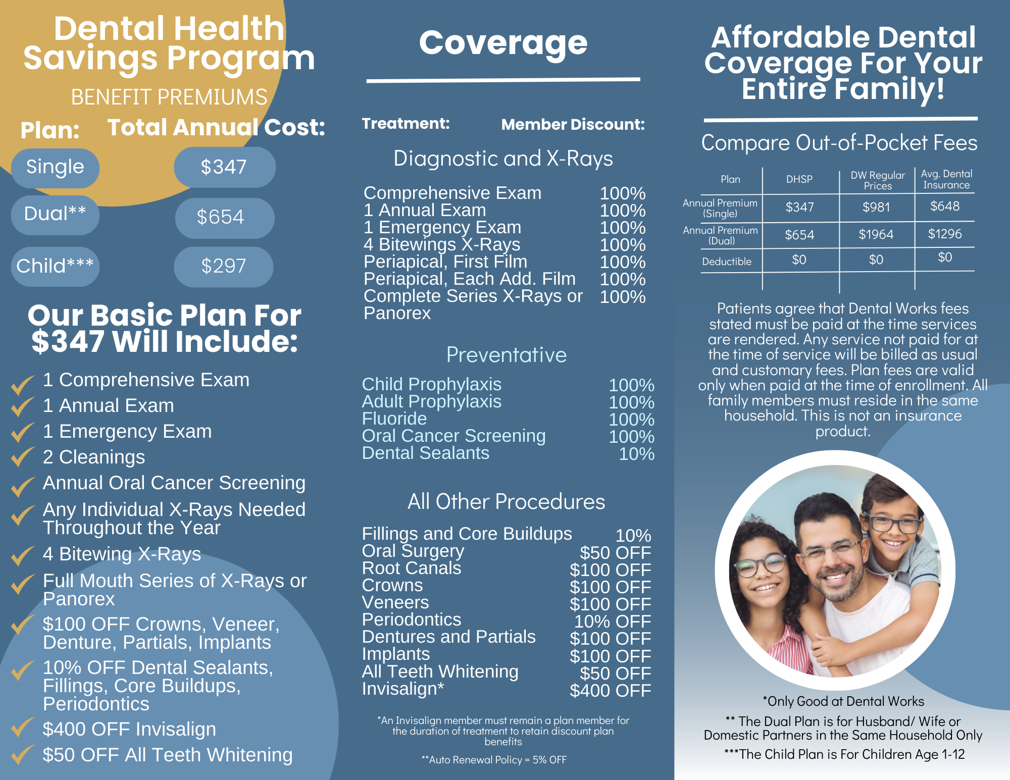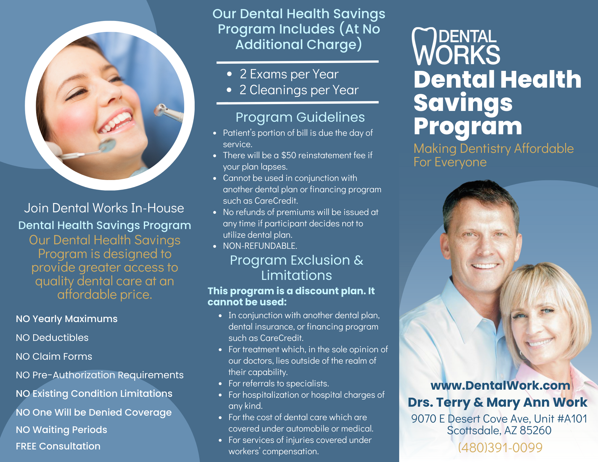 It's a discounted fee schedule for most services, only good at Dental Works. You save on everything from cleanings and fillings to cosmetic procedures and crowns.